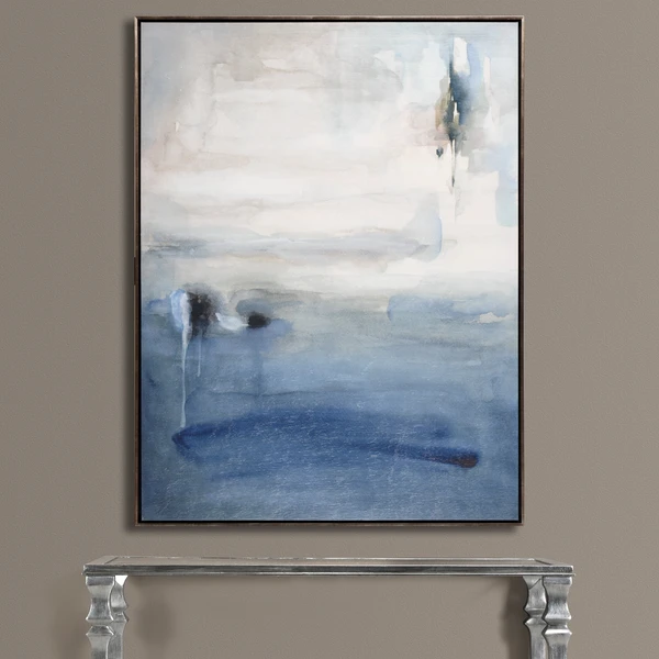 - Gallery wrapped giclee print on canvas with gel texture framed in a champagne floater frame.
