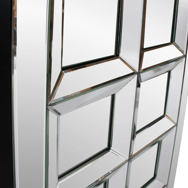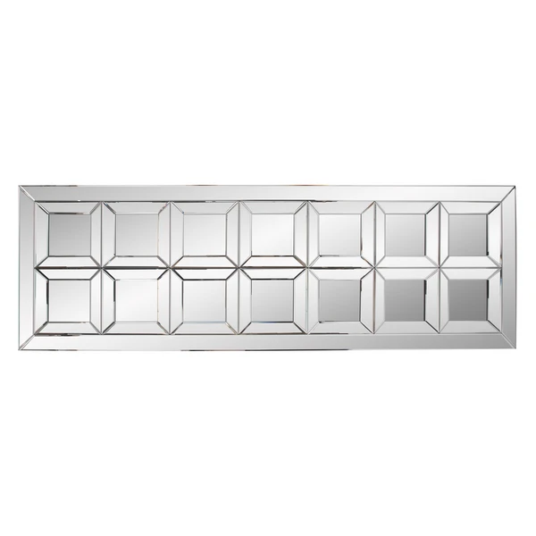 Featuring faceted, square mirrors arranged in a windowpane style, this mirror makes a striking focal point in any room. D-rings are affixed to the back of the mirror so it is ready to hang in a horizontal or vertical orientation.