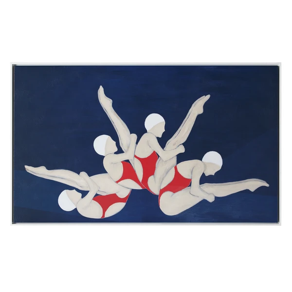 Beautifully composed with a modern sensibility, the divers in this image pop against a deep blue ground. Printed on canvas with a hand-applied image brush gel finish for added texture, this piece is displayed in a white floater frame.