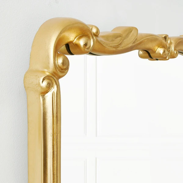 A standout addition to any space, this mirror shows off ornate flourishes and a metallic gold finish.