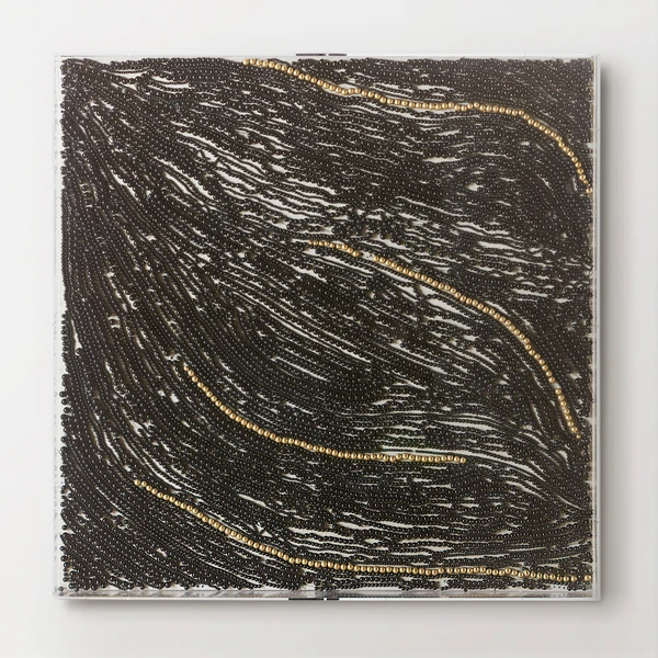 Perfect for adding texture, drama, and shine to your wall, this captivating composition features strands of black and gold beads displayed in a clear acrylic shadowbox frame.